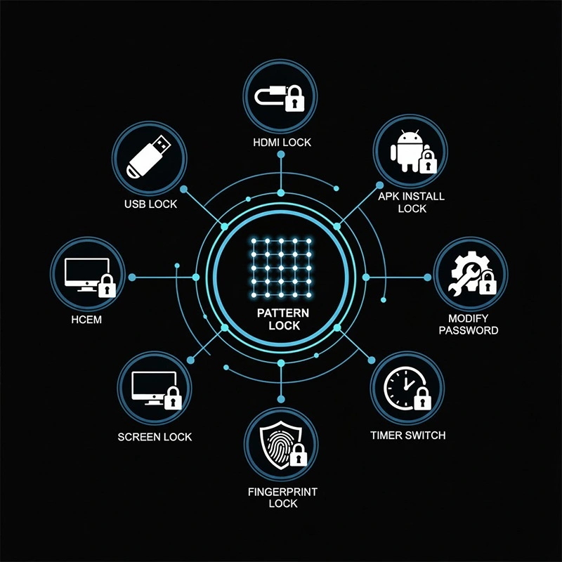 Qtenboard交互式平板電腦配備了多種安全措施來保護您的設備和數據: USB和HDMI鎖,屏幕鎖,圖案鎖,APK安裝鎖,密碼保護,定時開關和指紋鎖-在任何環境中保持設備的安全。